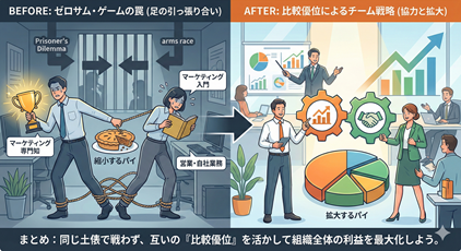 まとめ 職場で自分の強みが潰されそうになったときは、同じ土俵で「軍拡競争」を戦うのではなく、互いの「比較優位」を活かす役割分担のルールを作る視点を持ちましょう。経済学やゲーム理論のレンズを通せば、不毛な足の引っ張り合いを避け、チーム全体の利益を最大化する「賢い働き方」が見えてくるはずです。
